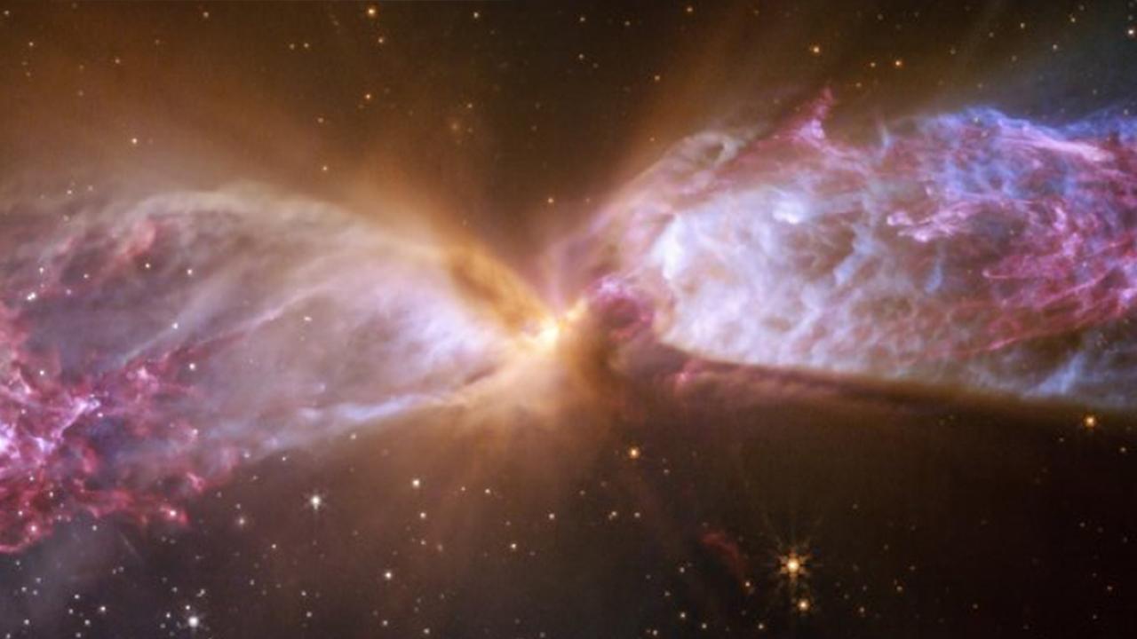 İki genç yıldızın 650 ışık yılı uzaklıktaki güçlü jetleri, gaz ve toz bulutlarıyla etkileşime girerek belirgin bir kum saati şekli oluşturuyor. Bu yıldızlar, etraflarındaki gaz ve tozu çekerek büyürken, bir kısmını da güçlü jetler halinde uzaya geri püskürtüyor.